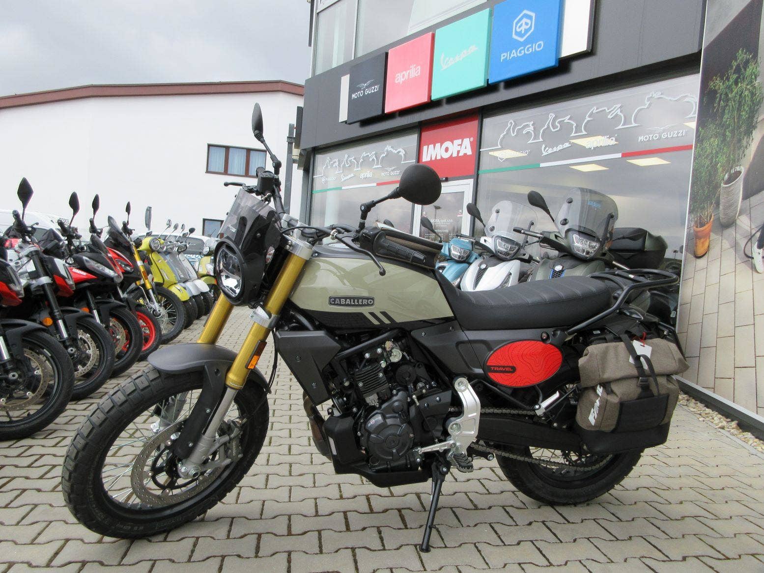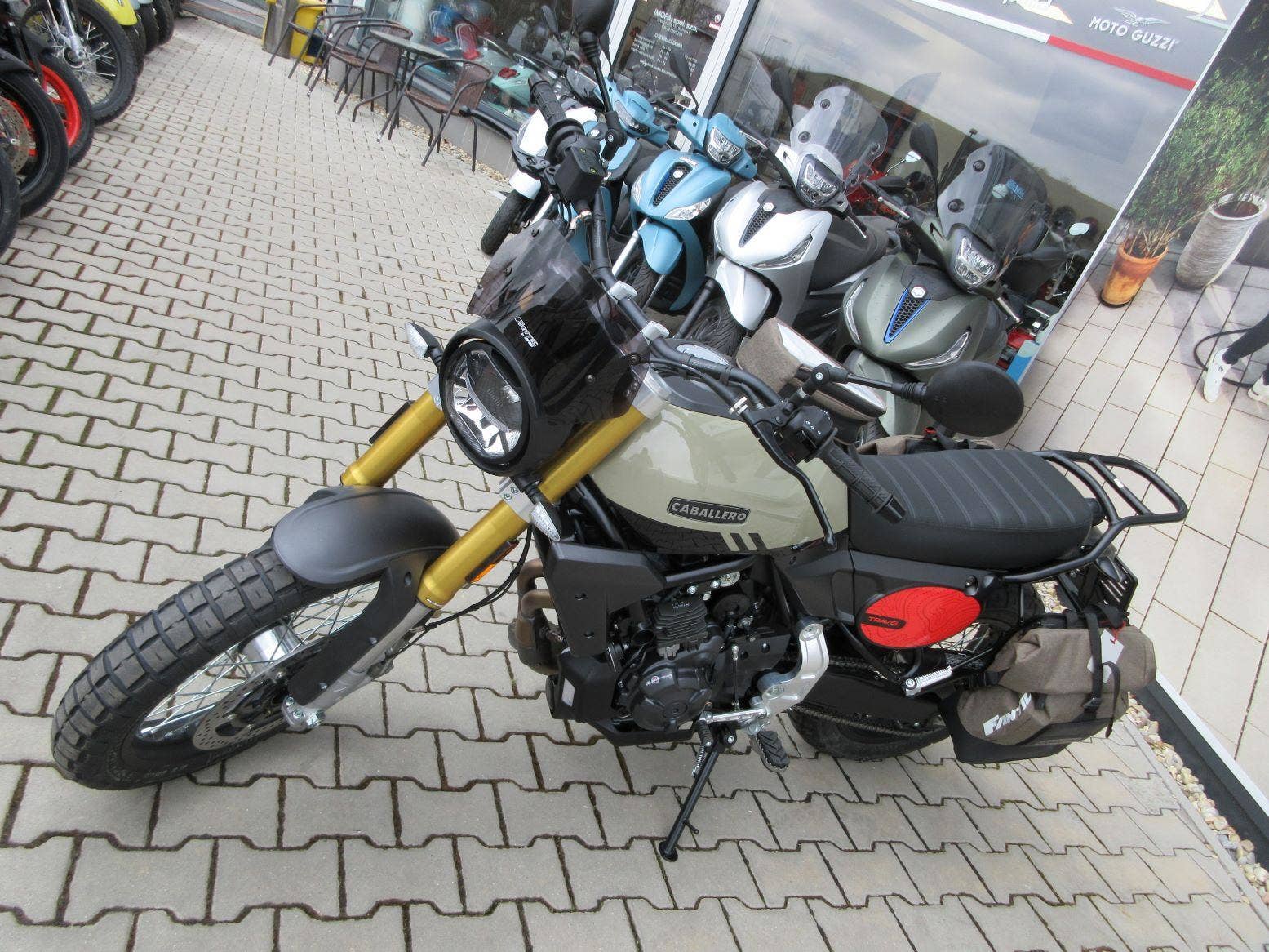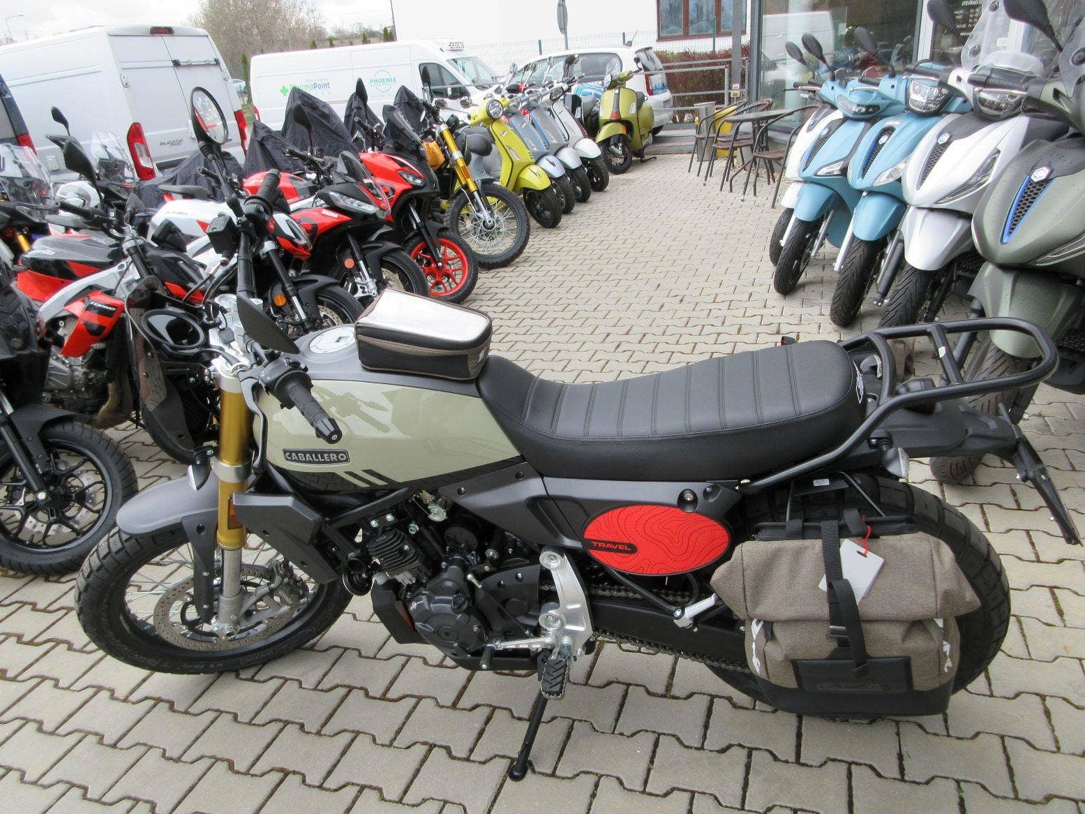 Oblíbené CABALLERO 700 v cestovatelské verzi TRAVEL - přední plexi štítek, brašna na nádrži, zadní nosič, boční rámy a brašny, originální barva a polepy. To vše umocňuje silný motor, špičková elektronika a pevný podvozek.
