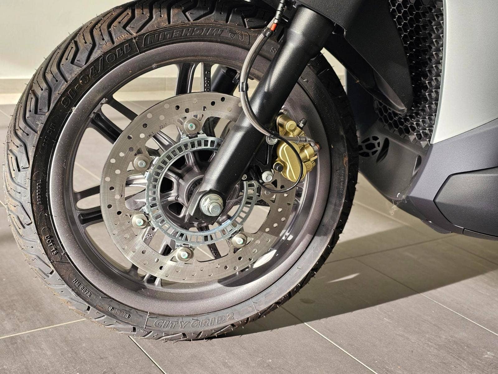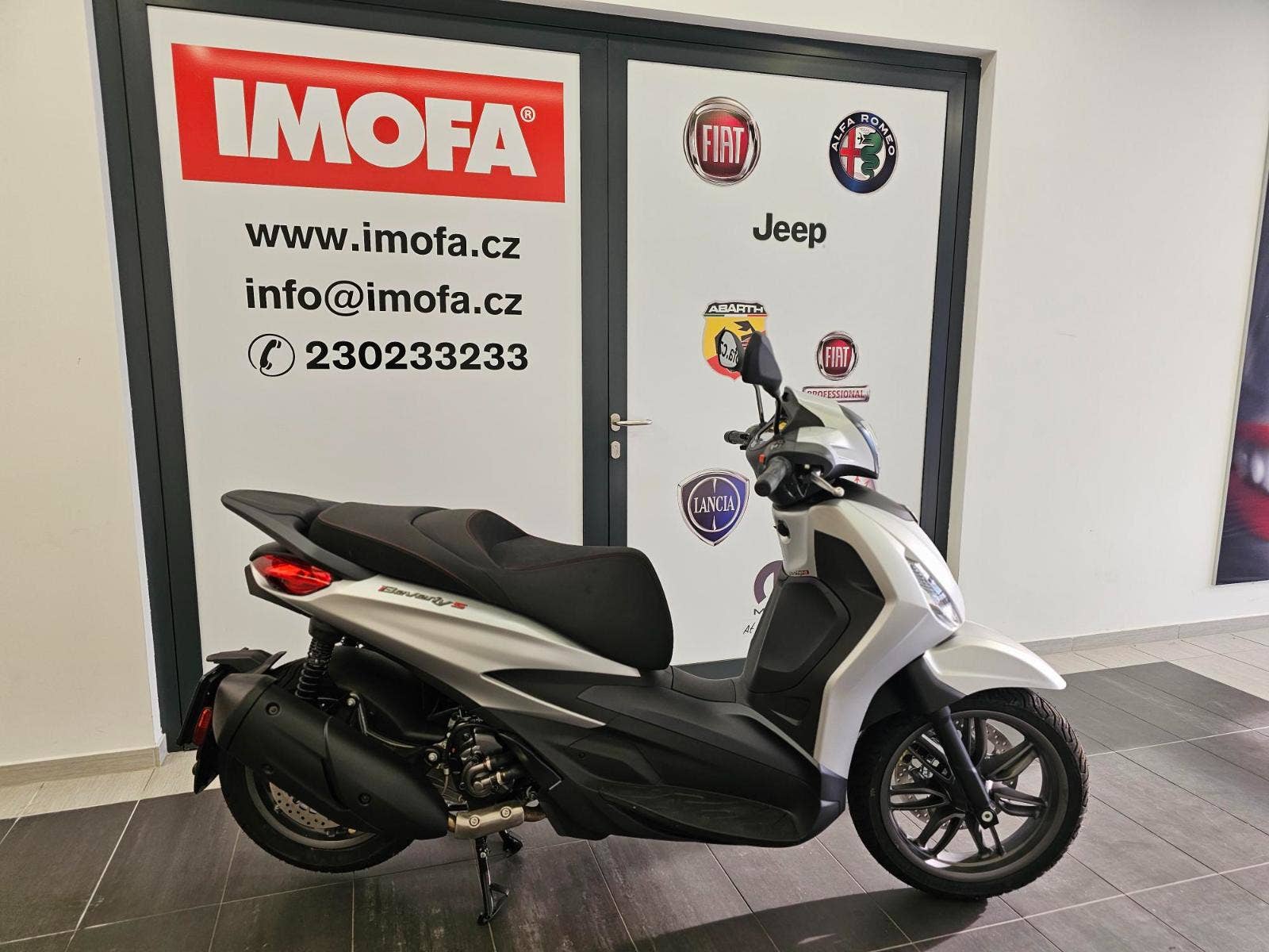 Beverly 400 S v matné stříbrné metalíze Argento Cometa. Model "S" s komunikační jednotkou MIA, ABS, kontrolou trakce, luxusní sedačkou, LCD dsiplejem s palubním počítačem nebo předním plexisklem (není na foto).